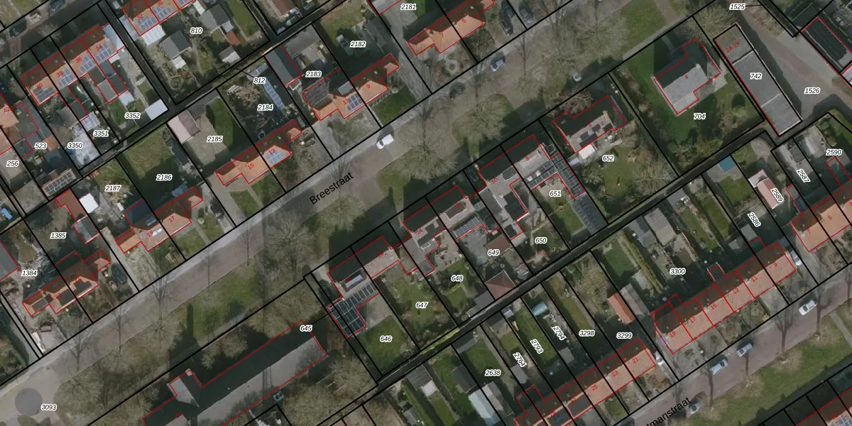 Het perceel waarop Breestraat 14 staat heeft een oppervlakte van 319 m². Dit is een groot perceel. De perceeloppervlakte wordt geregistreerd door het Kadaster. Gedetailleerde informatie over de maten van dit perceel kunt u vinden in het rapport Kadastrale kaart met maatvoering van Breestraat 14.