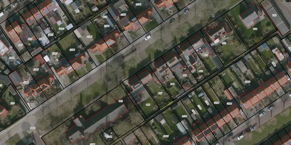 Het perceel waarop Breestraat 16 staat heeft een oppervlakte van 319 m². Dit is een groot perceel. De perceeloppervlakte wordt geregistreerd door het Kadaster. Gedetailleerde informatie over de maten van dit perceel kunt u vinden in het rapport Kadastrale kaart met maatvoering van Breestraat 16.
