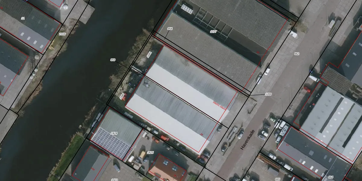 Het perceel waarop Havenkade 18-a-20 staat heeft een oppervlakte van 1297 m². Dit is een zeer groot perceel. De perceeloppervlakte wordt geregistreerd door het Kadaster. Gedetailleerde informatie over de maten van dit perceel kunt u vinden in het rapport Kadastrale kaart met maatvoering van Havenkade 18-a-20.