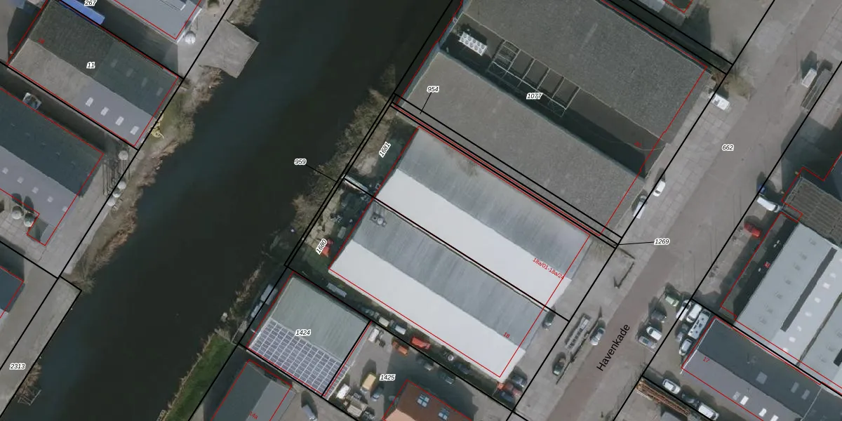Het perceel waarop Havenkade 18-a-23 staat heeft een oppervlakte van 1297 m². Dit is een zeer groot perceel. De perceeloppervlakte wordt geregistreerd door het Kadaster. Gedetailleerde informatie over de maten van dit perceel kunt u vinden in het rapport Kadastrale kaart met maatvoering van Havenkade 18-a-23.