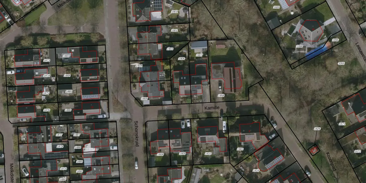 Het perceel waarop Kamille 1 staat heeft een oppervlakte van 303 m². Dit is een groot perceel. De perceeloppervlakte wordt geregistreerd door het Kadaster. Gedetailleerde informatie over de maten van dit perceel kunt u vinden in het rapport Kadastrale kaart met maatvoering van Kamille 1.