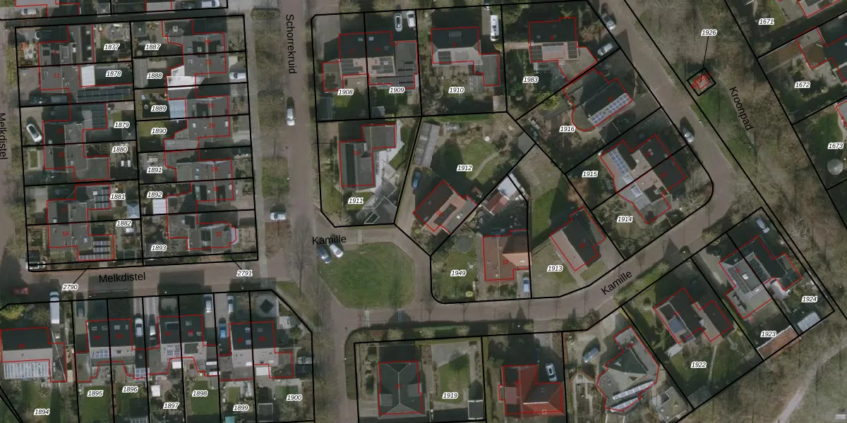 Het perceel waarop Kamille 20 staat heeft een oppervlakte van 653 m². Dit is een groot perceel. De perceeloppervlakte wordt geregistreerd door het Kadaster. Gedetailleerde informatie over de maten van dit perceel kunt u vinden in het rapport Kadastrale kaart met maatvoering van Kamille 20.