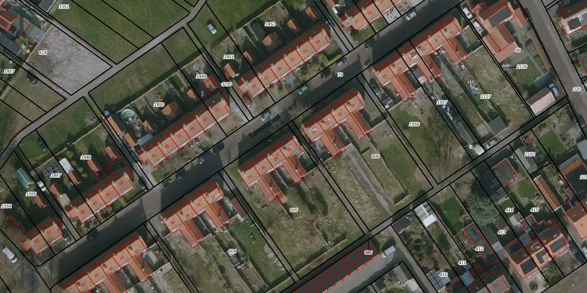 Het perceel waarop Torenstraat 26 staat heeft een oppervlakte van 1222 m². Dit is een zeer groot perceel. De perceeloppervlakte wordt geregistreerd door het Kadaster. Gedetailleerde informatie over de maten van dit perceel kunt u vinden in het rapport Kadastrale kaart met maatvoering van Torenstraat 26.