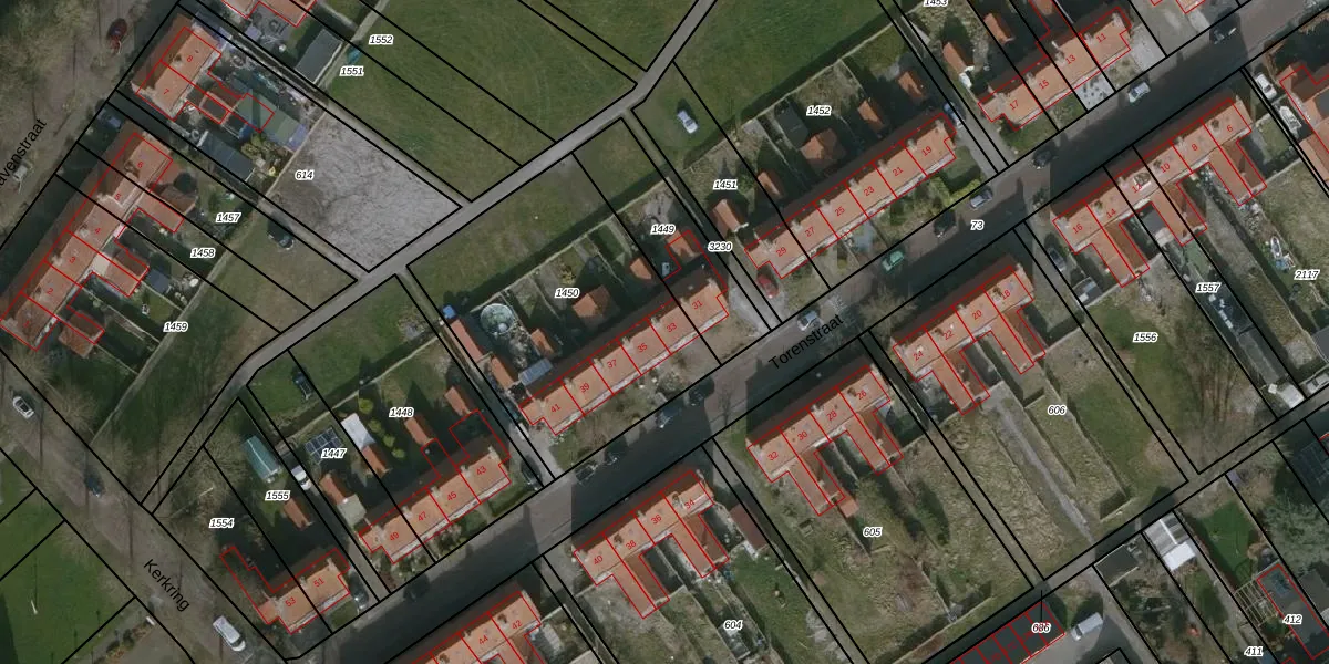 Het perceel waarop Torenstraat 33 staat heeft een oppervlakte van 1196 m². Dit is een zeer groot perceel. De perceeloppervlakte wordt geregistreerd door het Kadaster. Gedetailleerde informatie over de maten van dit perceel kunt u vinden in het rapport Kadastrale kaart met maatvoering van Torenstraat 33.