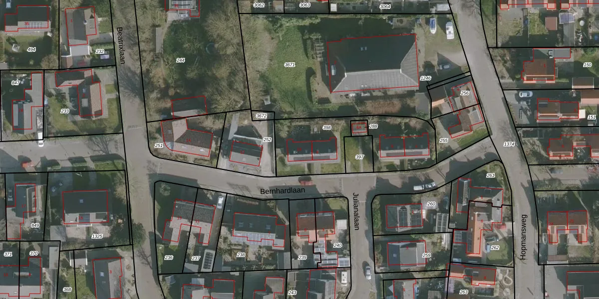 Het perceel waarop Bernhardlaan 10 staat heeft een oppervlakte van 845 m². Dit is een groot perceel. De perceeloppervlakte wordt geregistreerd door het Kadaster. Gedetailleerde informatie over de maten van dit perceel kunt u vinden in het rapport Kadastrale kaart met maatvoering van Bernhardlaan 10.