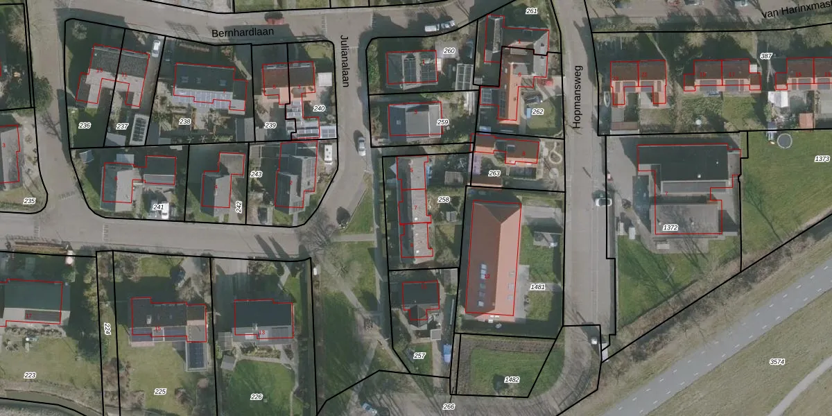 Het perceel waarop Julianalaan 7 staat heeft een oppervlakte van 525 m². Dit is een groot perceel. De perceeloppervlakte wordt geregistreerd door het Kadaster. Gedetailleerde informatie over de maten van dit perceel kunt u vinden in het rapport Kadastrale kaart met maatvoering van Julianalaan 7.