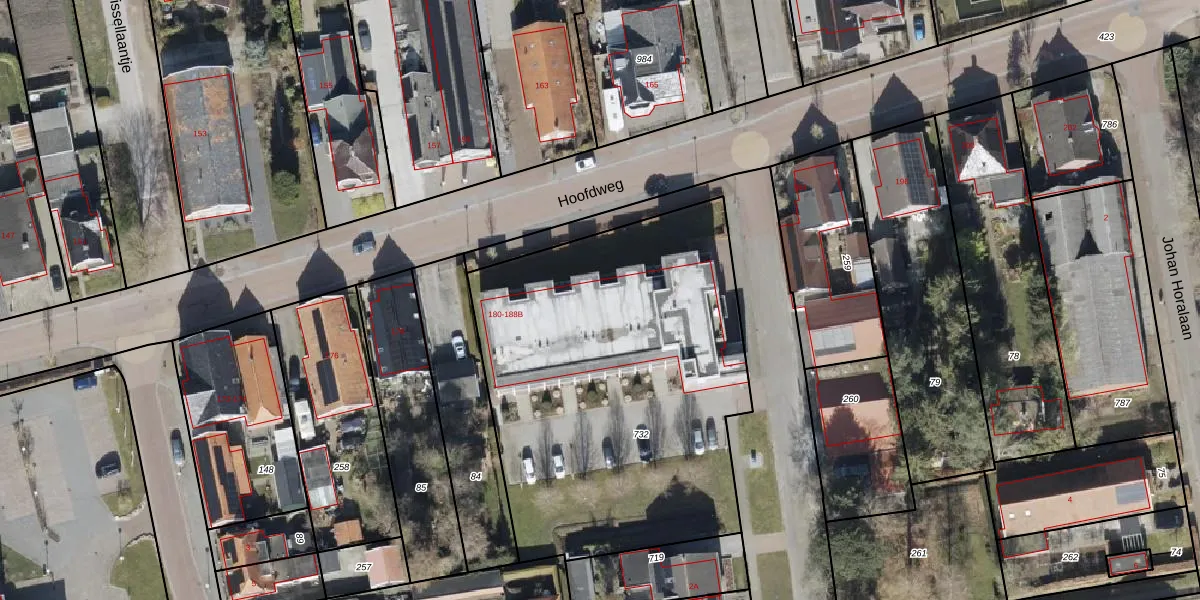Het perceel waarop Hoofdweg 184 staat heeft een oppervlakte van 2185 m². Dit is een zeer groot perceel. De perceeloppervlakte wordt geregistreerd door het Kadaster. Gedetailleerde informatie over de maten van dit perceel kunt u vinden in het rapport Kadastrale kaart met maatvoering van Hoofdweg 184.