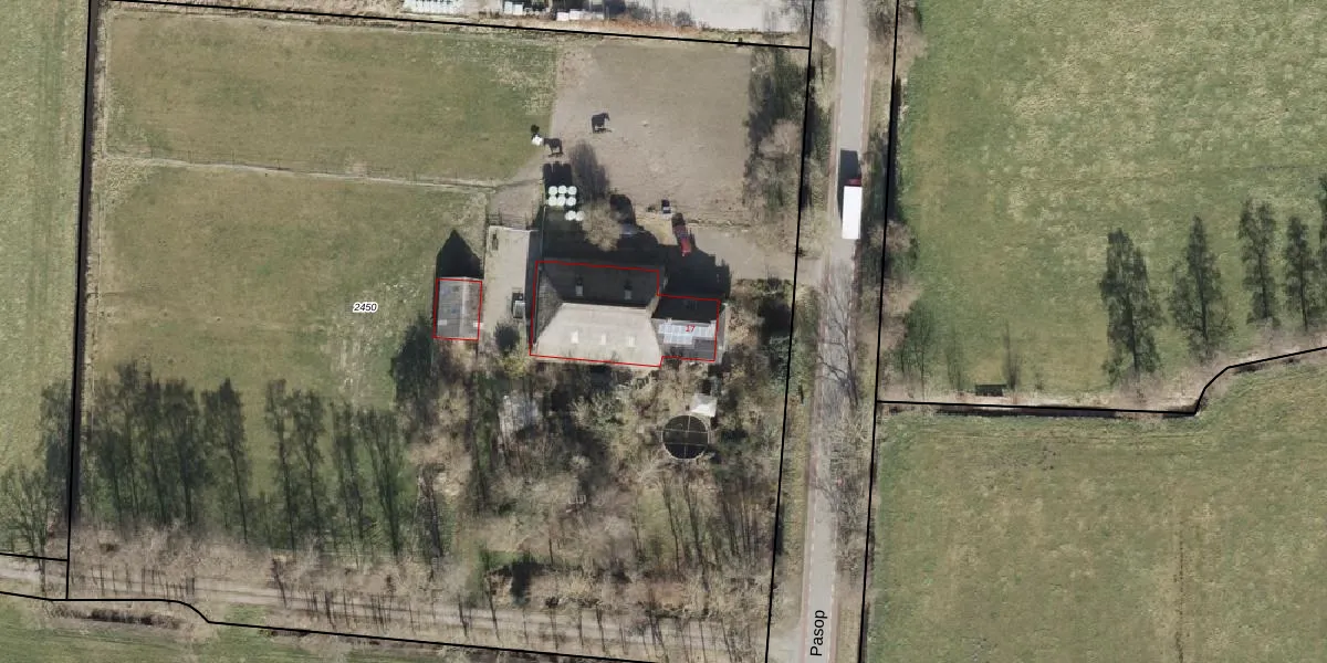 Het perceel waarop Pasop 17 staat heeft een oppervlakte van 1,0 ha. Dit is een zeer groot perceel. De perceeloppervlakte wordt geregistreerd door het Kadaster. Gedetailleerde informatie over de maten van dit perceel kunt u vinden in het rapport Kadastrale kaart met maatvoering van Pasop 17.