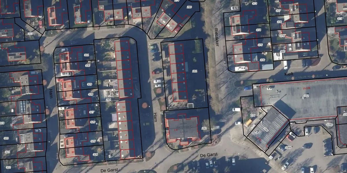 Het perceel waarop Harn 12 staat heeft een oppervlakte van 960 m². Dit is een groot perceel. De perceeloppervlakte wordt geregistreerd door het Kadaster. Gedetailleerde informatie over de maten van dit perceel kunt u vinden in het rapport Kadastrale kaart met maatvoering van Harn 12.
