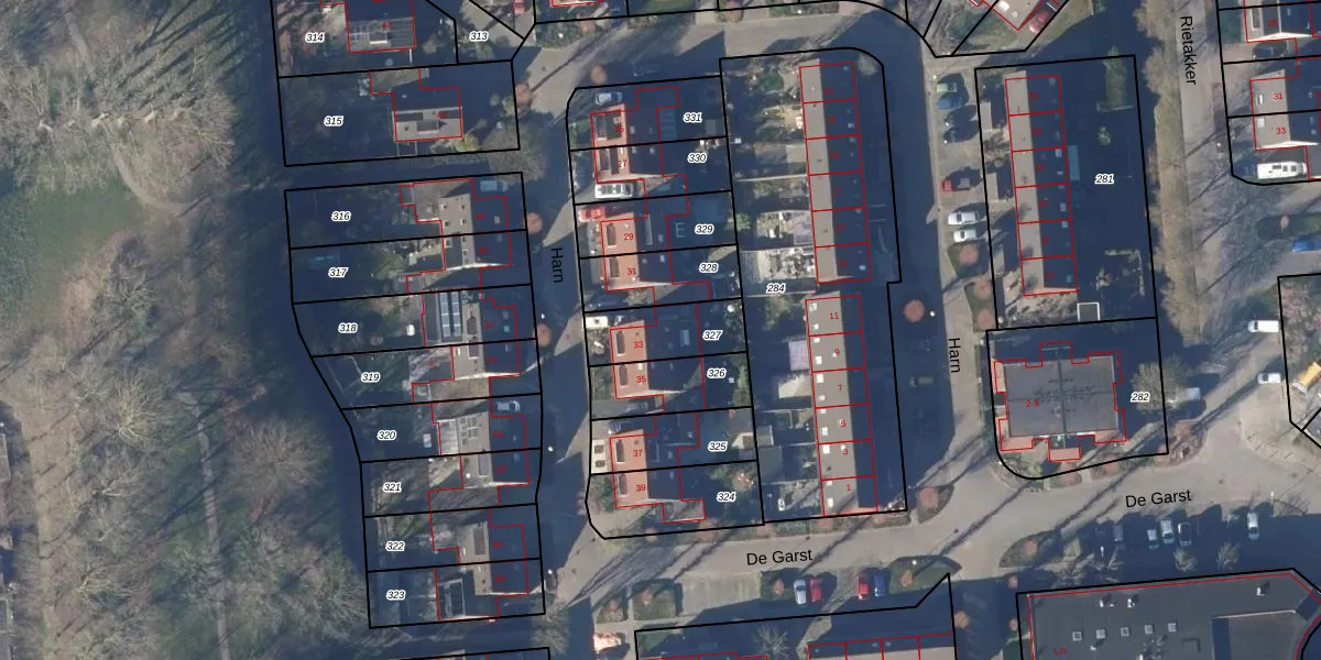 Het perceel waarop Harn 33 staat heeft een oppervlakte van 198 m². Dit is een middelgroot perceel. De perceeloppervlakte wordt geregistreerd door het Kadaster. Gedetailleerde informatie over de maten van dit perceel kunt u vinden in het rapport Kadastrale kaart met maatvoering van Harn 33.