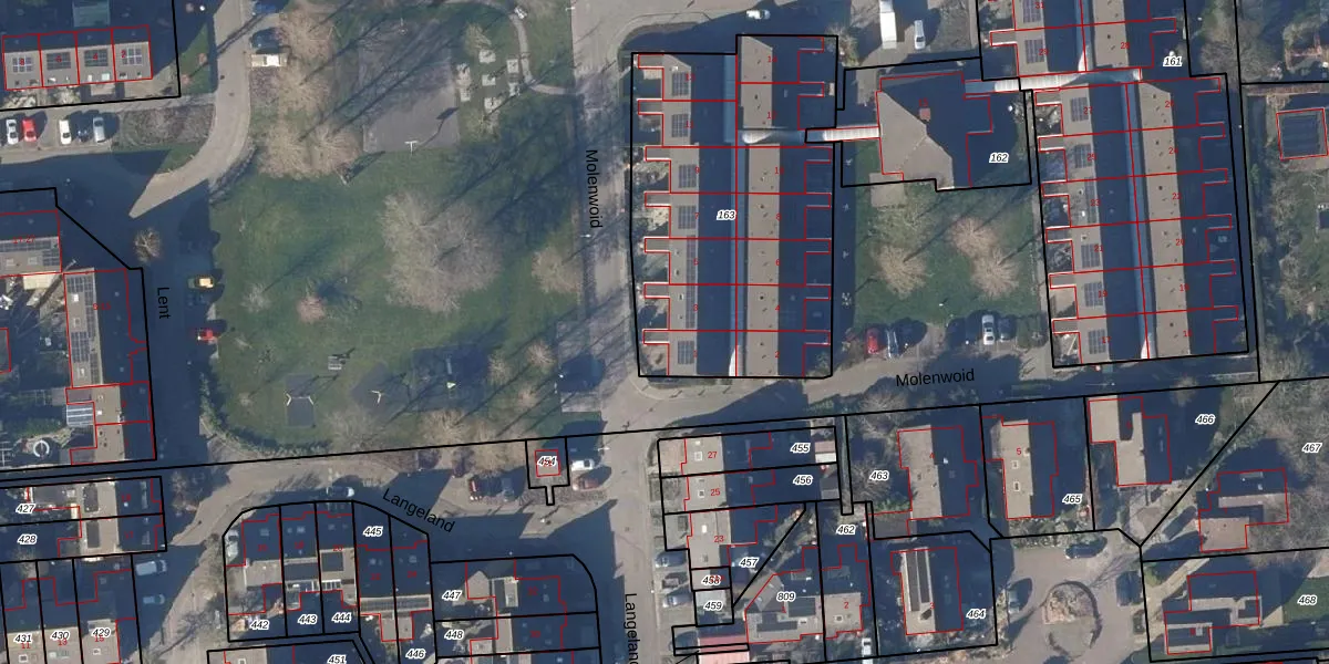 Het perceel waarop Molenwoid 1 staat heeft een oppervlakte van 1500 m². Dit is een zeer groot perceel. De perceeloppervlakte wordt geregistreerd door het Kadaster. Gedetailleerde informatie over de maten van dit perceel kunt u vinden in het rapport Kadastrale kaart met maatvoering van Molenwoid 1.