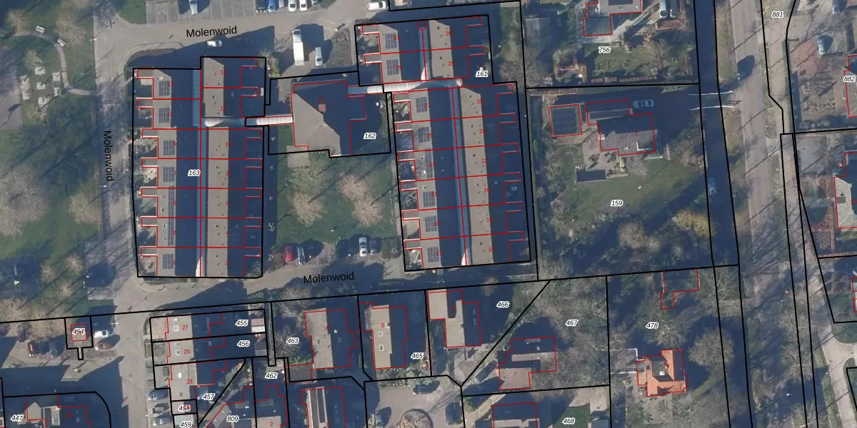 Het perceel waarop Molenwoid 19 staat heeft een oppervlakte van 1730 m². Dit is een zeer groot perceel. De perceeloppervlakte wordt geregistreerd door het Kadaster. Gedetailleerde informatie over de maten van dit perceel kunt u vinden in het rapport Kadastrale kaart met maatvoering van Molenwoid 19.