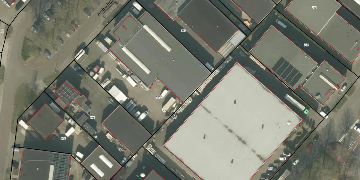 Het perceel waarop Ambachtweg 40-B staat heeft een oppervlakte van 2904 m². Dit is een zeer groot perceel. De perceeloppervlakte wordt geregistreerd door het Kadaster. Gedetailleerde informatie over de maten van dit perceel kunt u vinden in het rapport Kadastrale kaart met maatvoering van Ambachtweg 40-B.