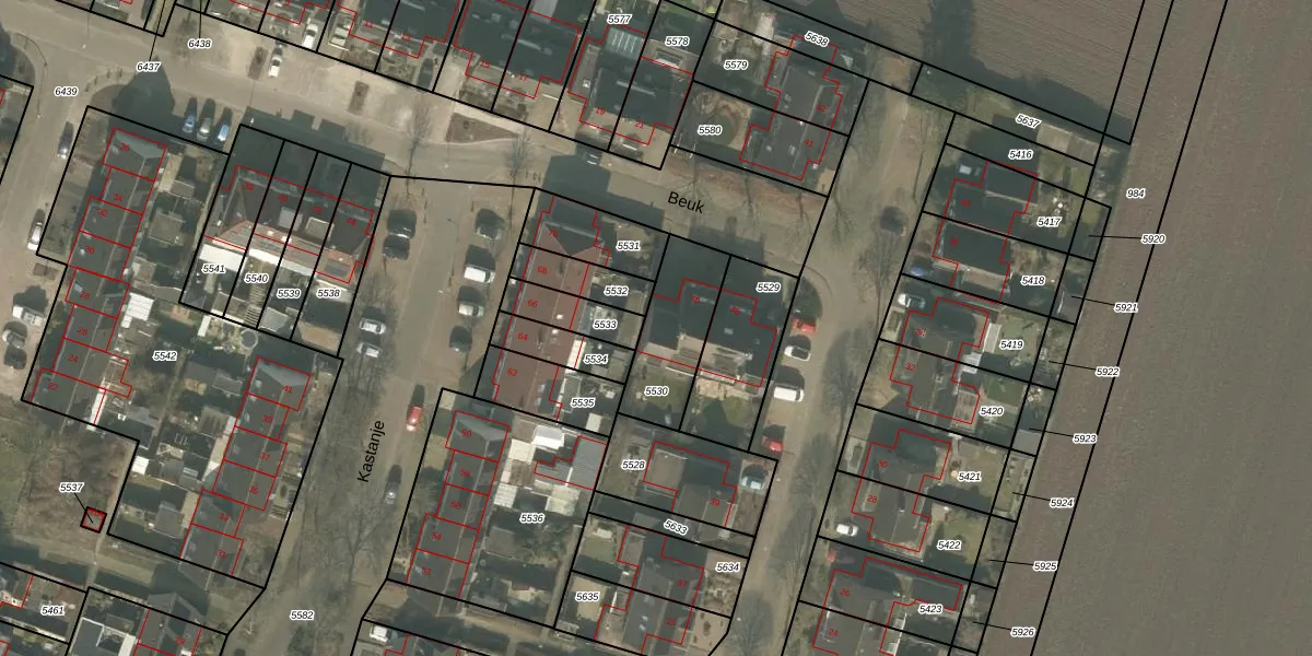 Het perceel waarop Beuk 46 staat heeft een oppervlakte van 277 m². Dit is een middelgroot perceel. De perceeloppervlakte wordt geregistreerd door het Kadaster. Gedetailleerde informatie over de maten van dit perceel kunt u vinden in het rapport Kadastrale kaart met maatvoering van Beuk 46.