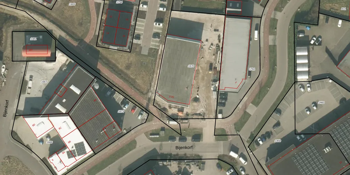 Het perceel waarop Bijenkorf 2 staat heeft een oppervlakte van 2023 m². Dit is een zeer groot perceel. De perceeloppervlakte wordt geregistreerd door het Kadaster. Gedetailleerde informatie over de maten van dit perceel kunt u vinden in het rapport Kadastrale kaart met maatvoering van Bijenkorf 2.
