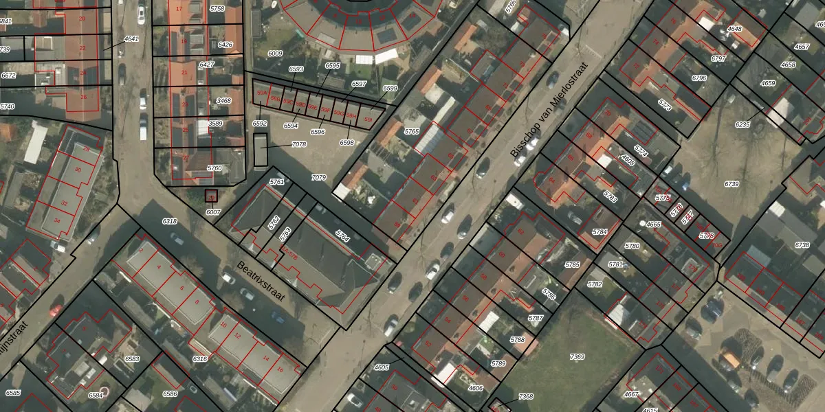 Bisschop van Mierlostraat 61 is gelegen op kadastraal perceel MLO01F5765. Deze kadastrale aanduiding is uniek en wordt gebruikt door het Kadaster om eigendomsrechten en andere zakelijke rechten vast te leggen. Het perceel maakt onderdeel uit van de kadastrale gemeente Mierlo.