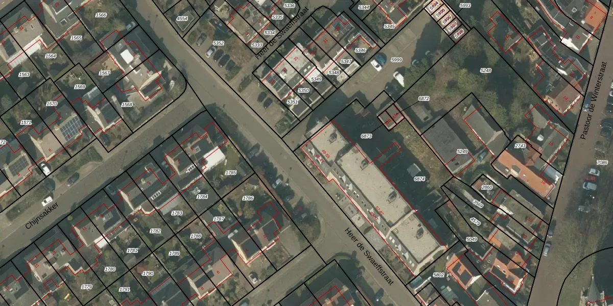 Het perceel waarop Heer de Swaeffstraat 45 staat heeft een oppervlakte van 1739 m². Dit is een zeer groot perceel. De perceeloppervlakte wordt geregistreerd door het Kadaster. Gedetailleerde informatie over de maten van dit perceel kunt u vinden in het rapport Kadastrale kaart met maatvoering van Heer de Swaeffstraat 45.