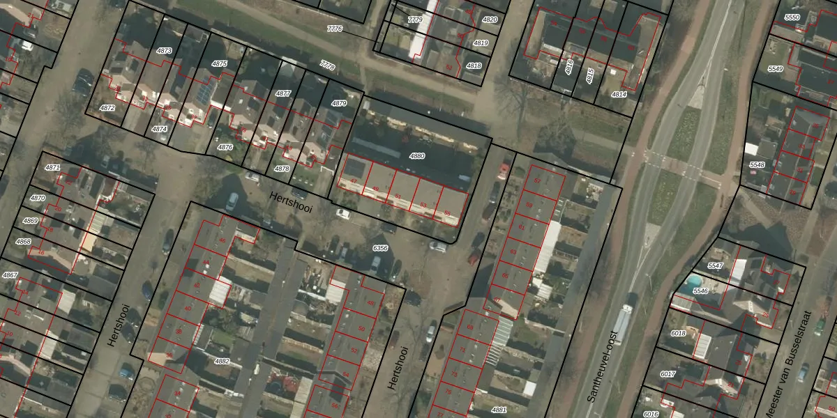 Hertshooi 53 is gelegen op kadastraal perceel MLO01F4880. Deze kadastrale aanduiding is uniek en wordt gebruikt door het Kadaster om eigendomsrechten en andere zakelijke rechten vast te leggen. Het perceel maakt onderdeel uit van de kadastrale gemeente Mierlo.