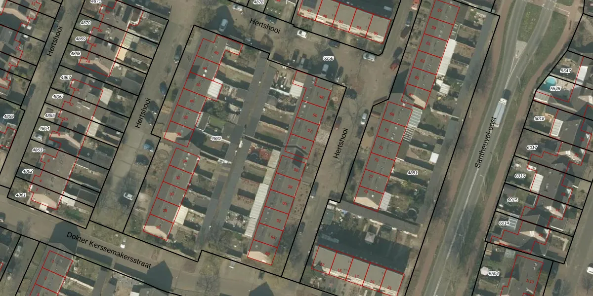 Hertshooi 54 is gelegen op kadastraal perceel MLO01F4882. Deze kadastrale aanduiding is uniek en wordt gebruikt door het Kadaster om eigendomsrechten en andere zakelijke rechten vast te leggen. Het perceel maakt onderdeel uit van de kadastrale gemeente Mierlo.