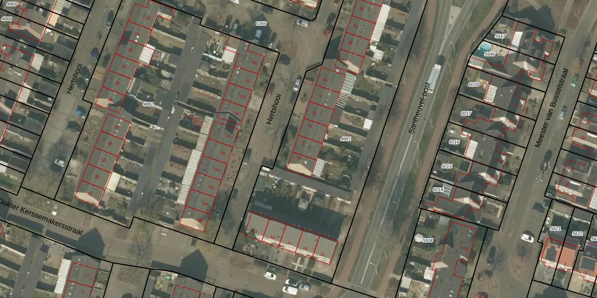 Het perceel waarop het adres ligt is MLO01-F-4881. De afkorting 'MLO01' staat voor kadastrale gemeente Mierlo. Het perceel is met 3246 m² relatief groot. Het gemiddelde ligt in de kadastrale gemeente Mierlo op 3053,93 m². Het kleinste perceel in de kadastrale gemeente is 0 m² groot. De grootste perceeloppervlakte is 1,20 km². Er zijn 17 adressen aanwezig op het perceel. In de Basisregistratie Kadaster (BRK) werden de grenzen van het perceel geregistreerd op 13-12-2011.