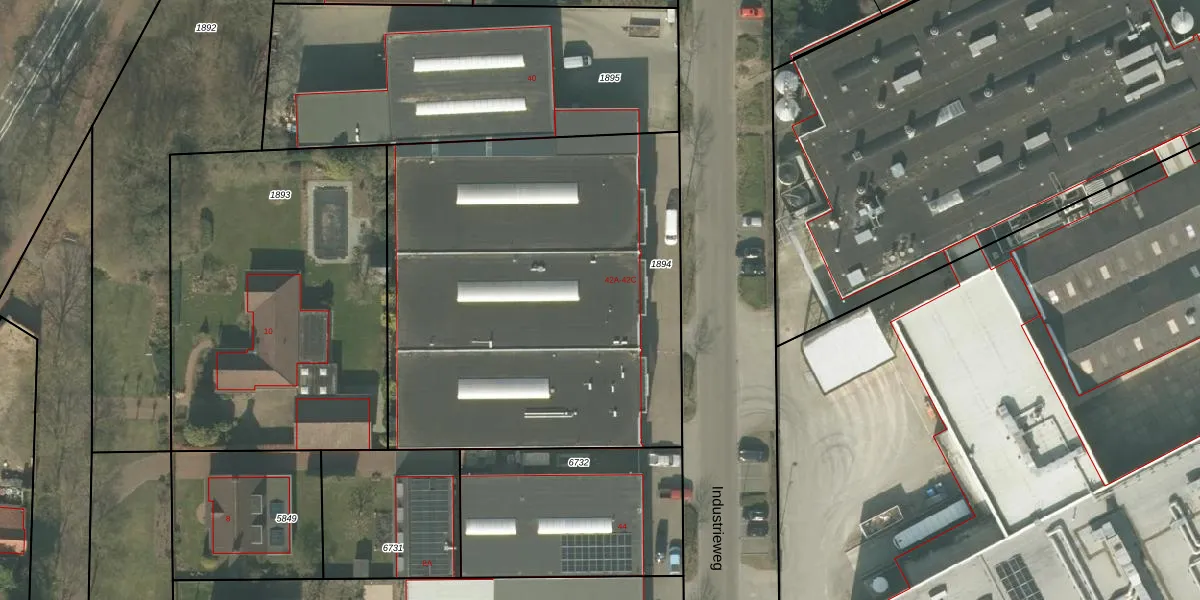 Het perceel waarop Industrieweg 42-B staat heeft een oppervlakte van 2520 m². Dit is een zeer groot perceel. De perceeloppervlakte wordt geregistreerd door het Kadaster. Gedetailleerde informatie over de maten van dit perceel kunt u vinden in het rapport Kadastrale kaart met maatvoering van Industrieweg 42-B.