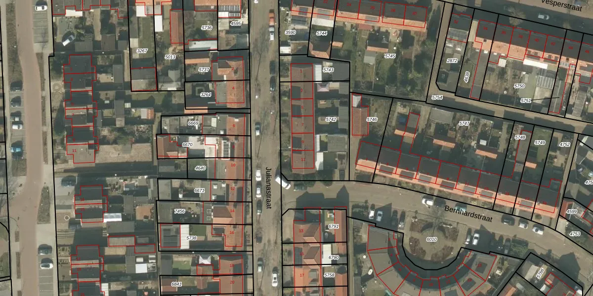 Julianastraat 9 is gelegen op kadastraal perceel MLO01F5742. Deze kadastrale aanduiding is uniek en wordt gebruikt door het Kadaster om eigendomsrechten en andere zakelijke rechten vast te leggen. Het perceel maakt onderdeel uit van de kadastrale gemeente Mierlo.