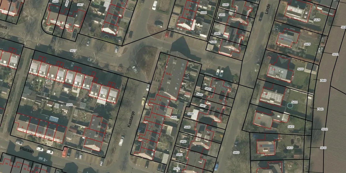 Kastanje 22 is gelegen op kadastraal perceel MLO01F5458. Deze kadastrale aanduiding is uniek en wordt gebruikt door het Kadaster om eigendomsrechten en andere zakelijke rechten vast te leggen. Het perceel maakt onderdeel uit van de kadastrale gemeente Mierlo.