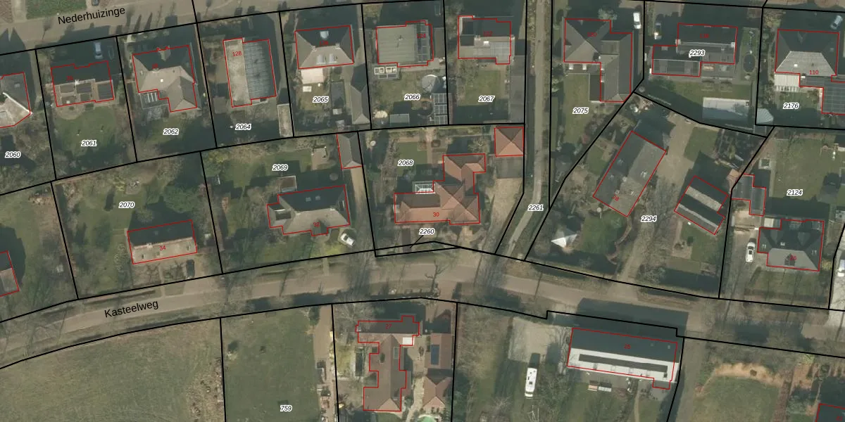 Het perceel waarop Kasteelweg 30 staat heeft een oppervlakte van 1035 m². Dit is een zeer groot perceel. De perceeloppervlakte wordt geregistreerd door het Kadaster. Gedetailleerde informatie over de maten van dit perceel kunt u vinden in het rapport Kadastrale kaart met maatvoering van Kasteelweg 30.