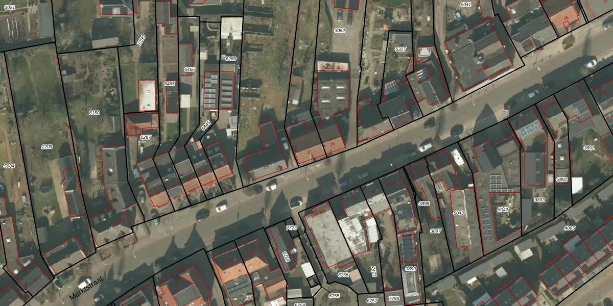 Het perceel waarop Marktstraat 27 staat heeft een oppervlakte van 1030 m². Dit is een zeer groot perceel. De perceeloppervlakte wordt geregistreerd door het Kadaster. Gedetailleerde informatie over de maten van dit perceel kunt u vinden in het rapport Kadastrale kaart met maatvoering van Marktstraat 27.