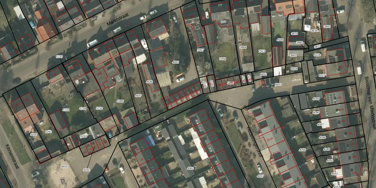 Het perceel waarop Marktstraat 66-E staat heeft een oppervlakte van 1043 m². Dit is een zeer groot perceel. De perceeloppervlakte wordt geregistreerd door het Kadaster. Gedetailleerde informatie over de maten van dit perceel kunt u vinden in het rapport Kadastrale kaart met maatvoering van Marktstraat 66-E.