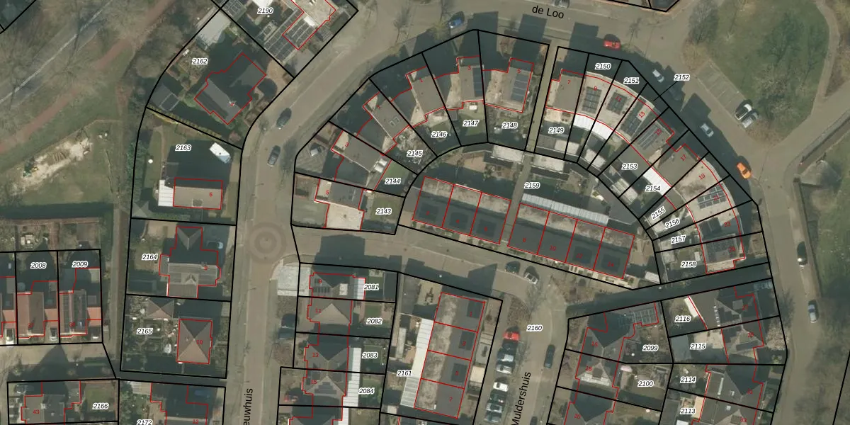 Het perceel waarop Muldershuis 2 staat heeft een oppervlakte van 1287 m². Dit is een zeer groot perceel. De perceeloppervlakte wordt geregistreerd door het Kadaster. Gedetailleerde informatie over de maten van dit perceel kunt u vinden in het rapport Kadastrale kaart met maatvoering van Muldershuis 2.