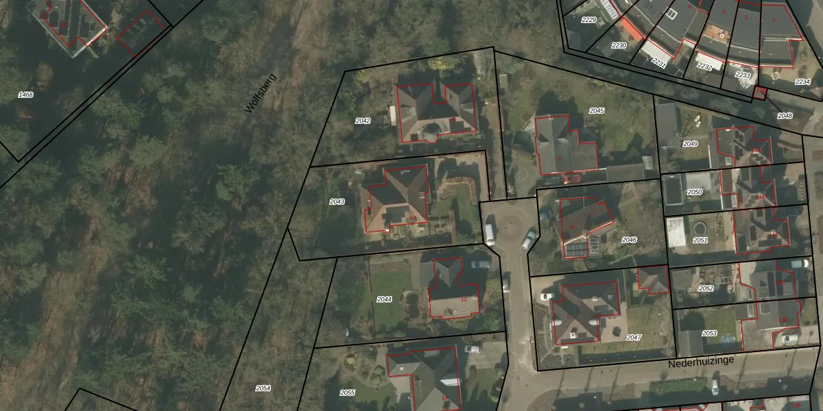 Nederhuizinge 10 is gelegen op kadastraal perceel MLO01E2043. Deze kadastrale aanduiding is uniek en wordt gebruikt door het Kadaster om eigendomsrechten en andere zakelijke rechten vast te leggen. Het perceel maakt onderdeel uit van de kadastrale gemeente Mierlo.