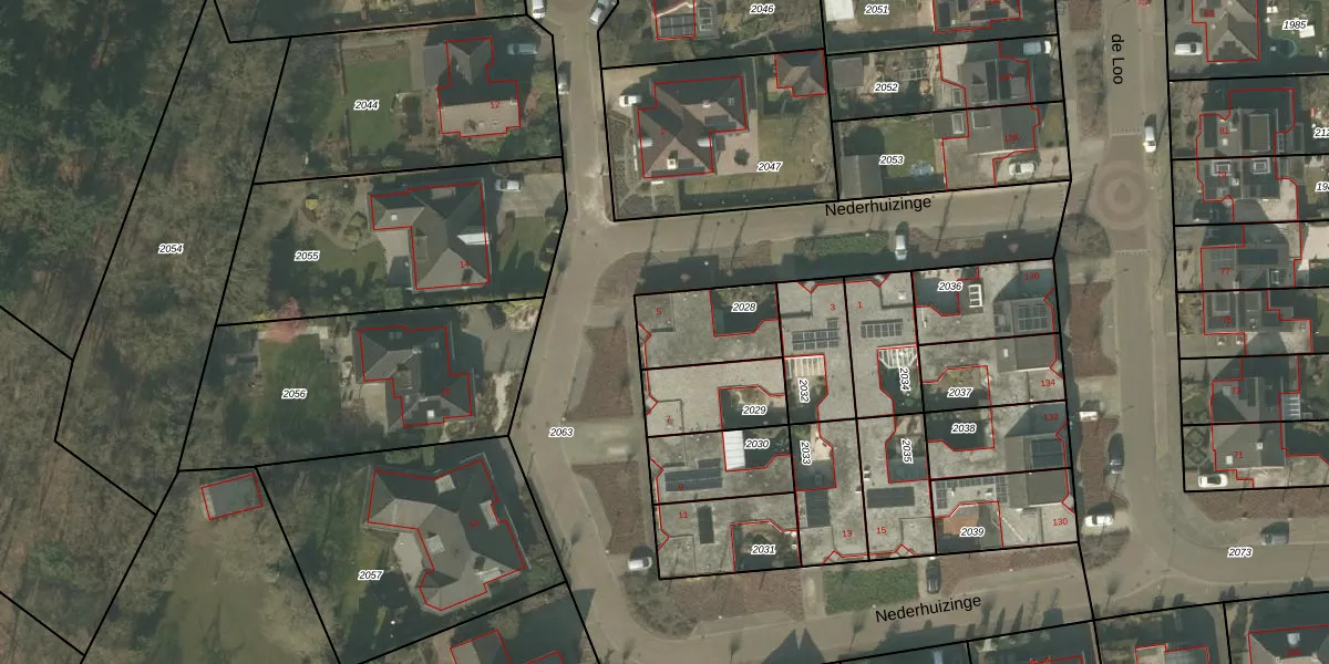 Nederhuizinge 5 is gelegen op kadastraal perceel MLO01E2028. Deze kadastrale aanduiding is uniek en wordt gebruikt door het Kadaster om eigendomsrechten en andere zakelijke rechten vast te leggen. Het perceel maakt onderdeel uit van de kadastrale gemeente Mierlo.