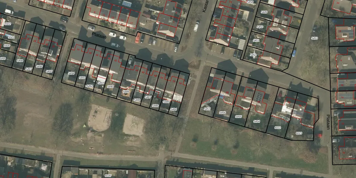 Plataan 54 is gelegen op kadastraal perceel MLO01F5484. Deze kadastrale aanduiding is uniek en wordt gebruikt door het Kadaster om eigendomsrechten en andere zakelijke rechten vast te leggen. Het perceel maakt onderdeel uit van de kadastrale gemeente Mierlo.