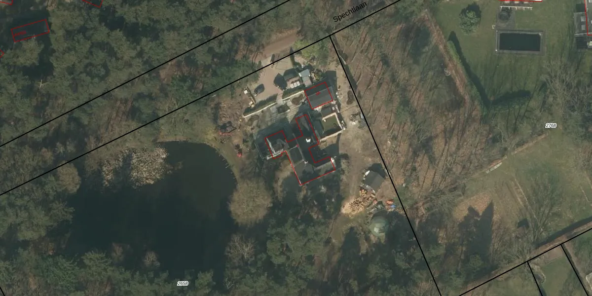 Het perceel waarop Spechtlaan 2 staat heeft een oppervlakte van 1,4 ha. Dit is een zeer groot perceel. De perceeloppervlakte wordt geregistreerd door het Kadaster. Gedetailleerde informatie over de maten van dit perceel kunt u vinden in het rapport Kadastrale kaart met maatvoering van Spechtlaan 2.