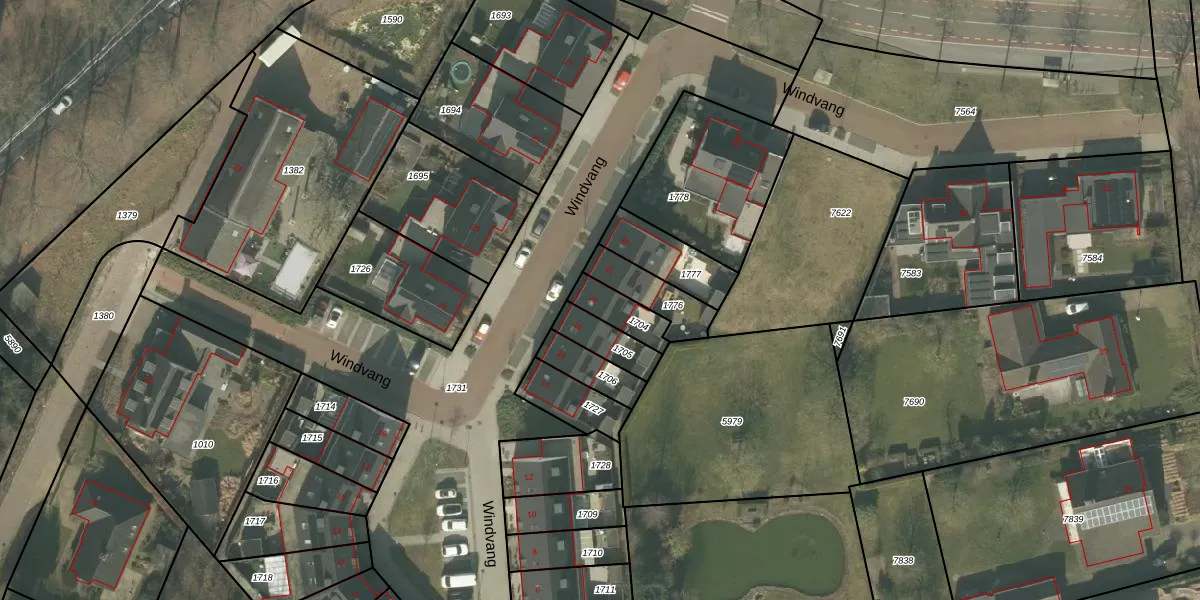 Het perceel waarop Windvang 20 staat heeft een oppervlakte van 95 m². Dit is een klein perceel. De perceeloppervlakte wordt geregistreerd door het Kadaster. Gedetailleerde informatie over de maten van dit perceel kunt u vinden in het rapport Kadastrale kaart met maatvoering van Windvang 20.