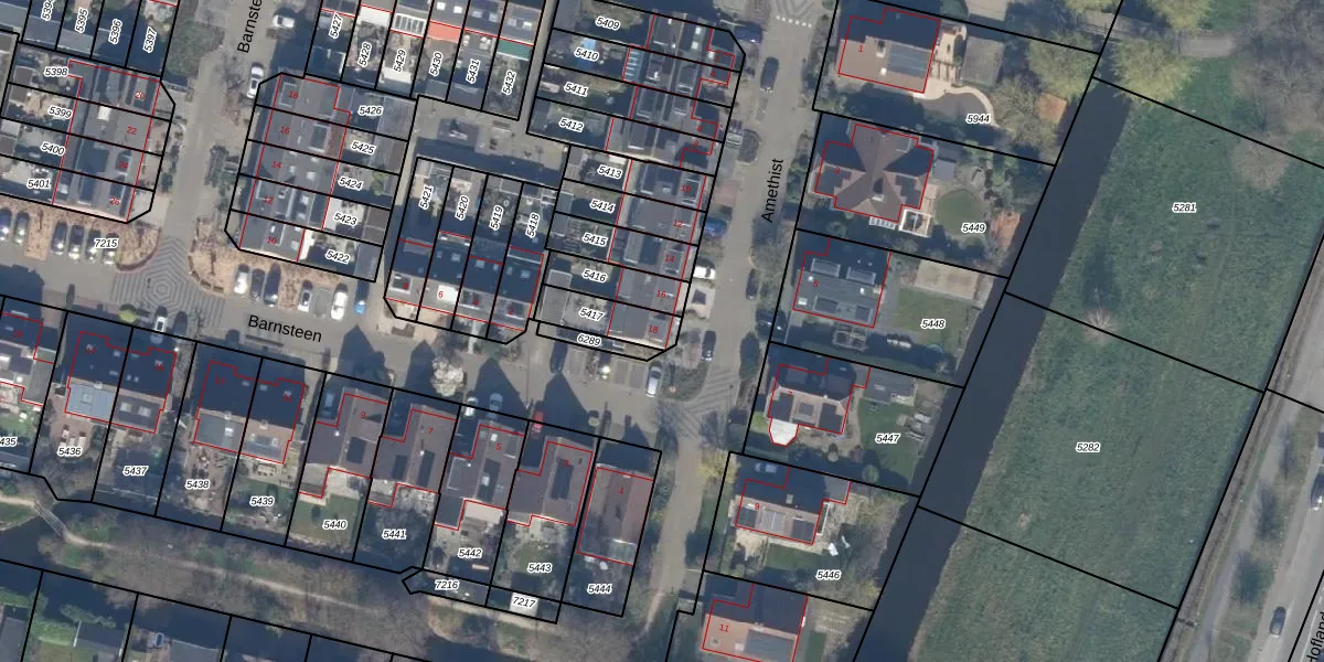 Het perceel waarop Amethist 18 staat heeft een oppervlakte van 121 m². Dit is een middelgroot perceel. De perceeloppervlakte wordt geregistreerd door het Kadaster. Gedetailleerde informatie over de maten van dit perceel kunt u vinden in het rapport Kadastrale kaart met maatvoering van Amethist 18.