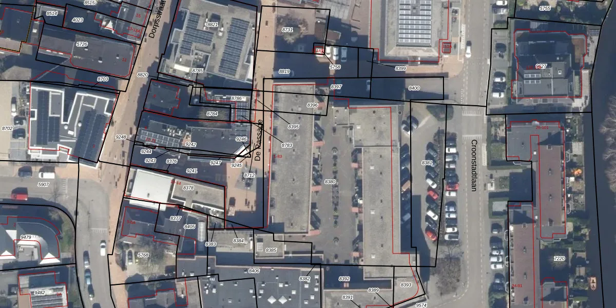 Het perceel waarop De Passage 44 staat heeft een oppervlakte van 2390 m². Dit is een zeer groot perceel. De perceeloppervlakte wordt geregistreerd door het Kadaster. Gedetailleerde informatie over de maten van dit perceel kunt u vinden in het rapport Kadastrale kaart met maatvoering van De Passage 44.