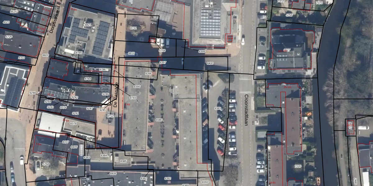 Het perceel waarop De Passage 81 staat heeft een oppervlakte van 2390 m². Dit is een zeer groot perceel. De perceeloppervlakte wordt geregistreerd door het Kadaster. Gedetailleerde informatie over de maten van dit perceel kunt u vinden in het rapport Kadastrale kaart met maatvoering van De Passage 81.