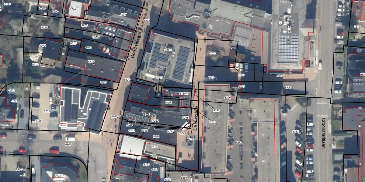 Het perceel waarop De Passage 9 staat heeft een oppervlakte van 93 m². Dit is een klein perceel. De perceeloppervlakte wordt geregistreerd door het Kadaster. Gedetailleerde informatie over de maten van dit perceel kunt u vinden in het rapport Kadastrale kaart met maatvoering van De Passage 9.