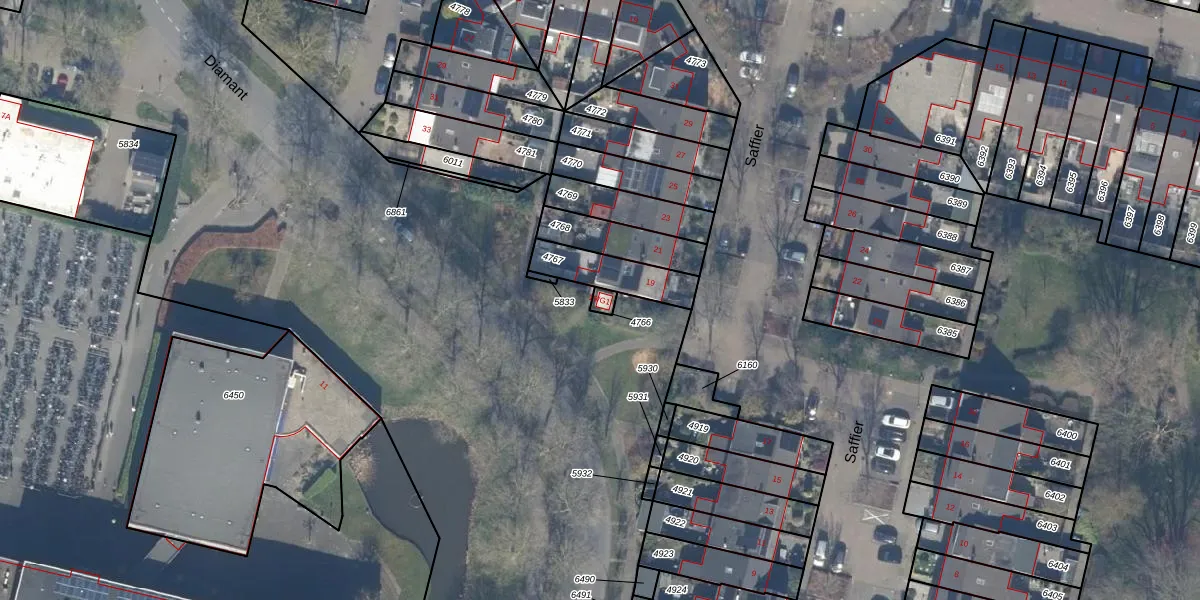 Het perceel waarop Diamant 19-G1 staat heeft een oppervlakte van 16 m². Dit is een klein perceel. De perceeloppervlakte wordt geregistreerd door het Kadaster. Gedetailleerde informatie over de maten van dit perceel kunt u vinden in het rapport Kadastrale kaart met maatvoering van Diamant 19-G1.