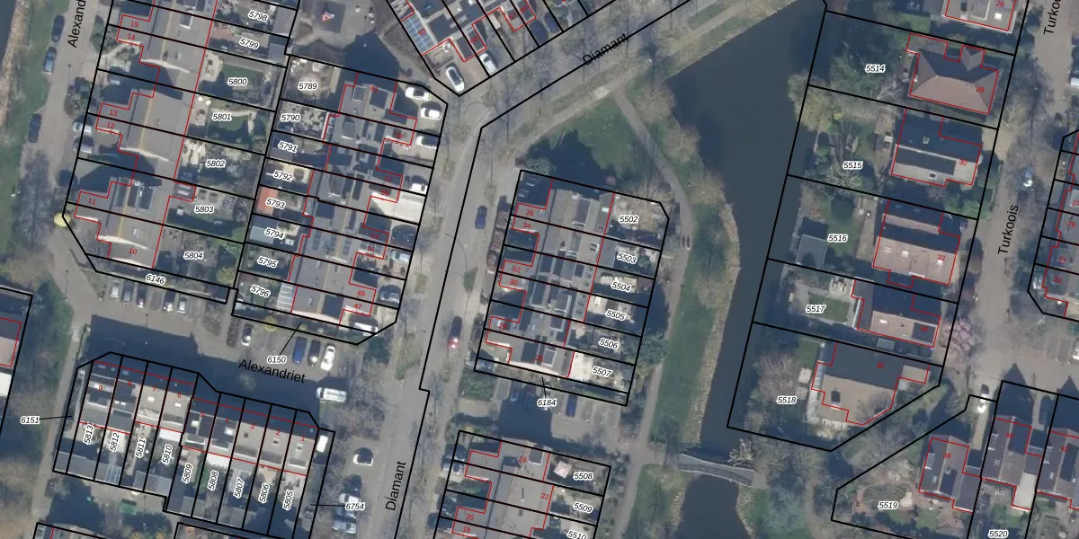 Het perceel waarop Diamant 32 staat heeft een oppervlakte van 157 m². Dit is een middelgroot perceel. De perceeloppervlakte wordt geregistreerd door het Kadaster. Gedetailleerde informatie over de maten van dit perceel kunt u vinden in het rapport Kadastrale kaart met maatvoering van Diamant 32.