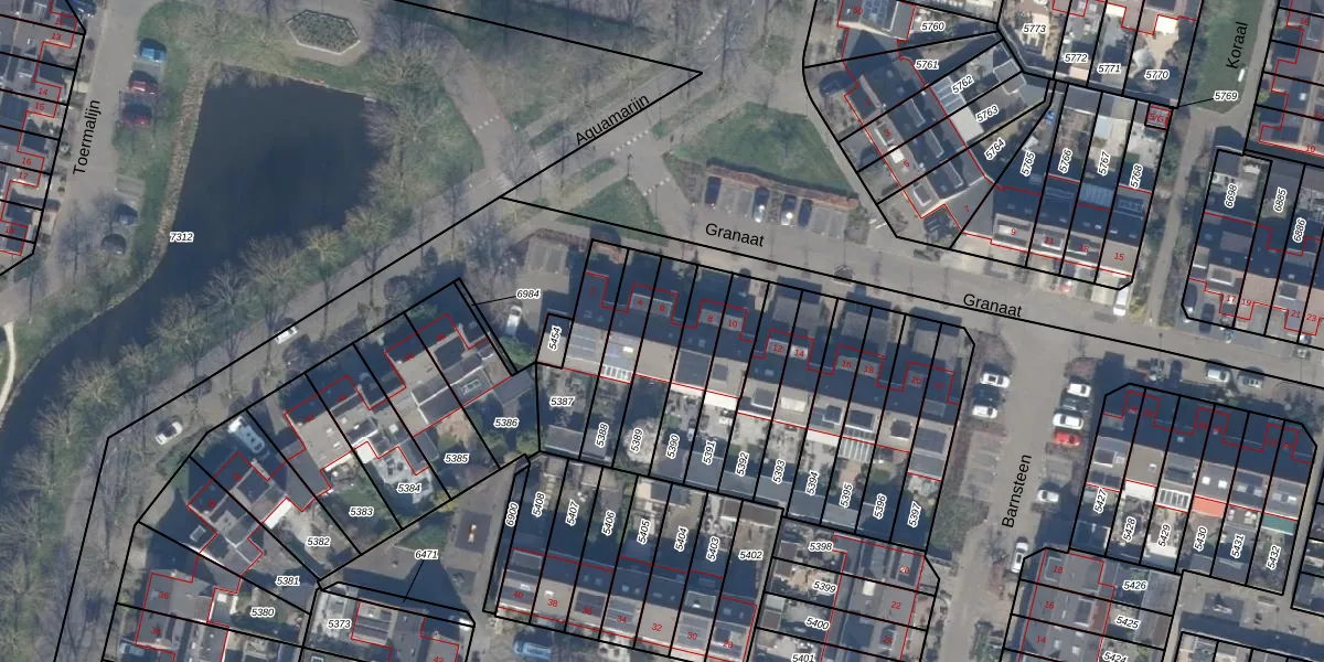 Het perceel waarop Granaat 6 staat heeft een oppervlakte van 178 m². Dit is een middelgroot perceel. De perceeloppervlakte wordt geregistreerd door het Kadaster. Gedetailleerde informatie over de maten van dit perceel kunt u vinden in het rapport Kadastrale kaart met maatvoering van Granaat 6.