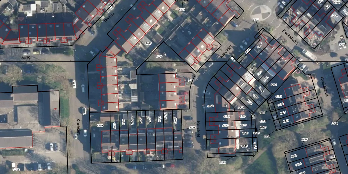Het perceel waarop Karekiet 40 staat heeft een oppervlakte van 3895 m². Dit is een zeer groot perceel. De perceeloppervlakte wordt geregistreerd door het Kadaster. Gedetailleerde informatie over de maten van dit perceel kunt u vinden in het rapport Kadastrale kaart met maatvoering van Karekiet 40.