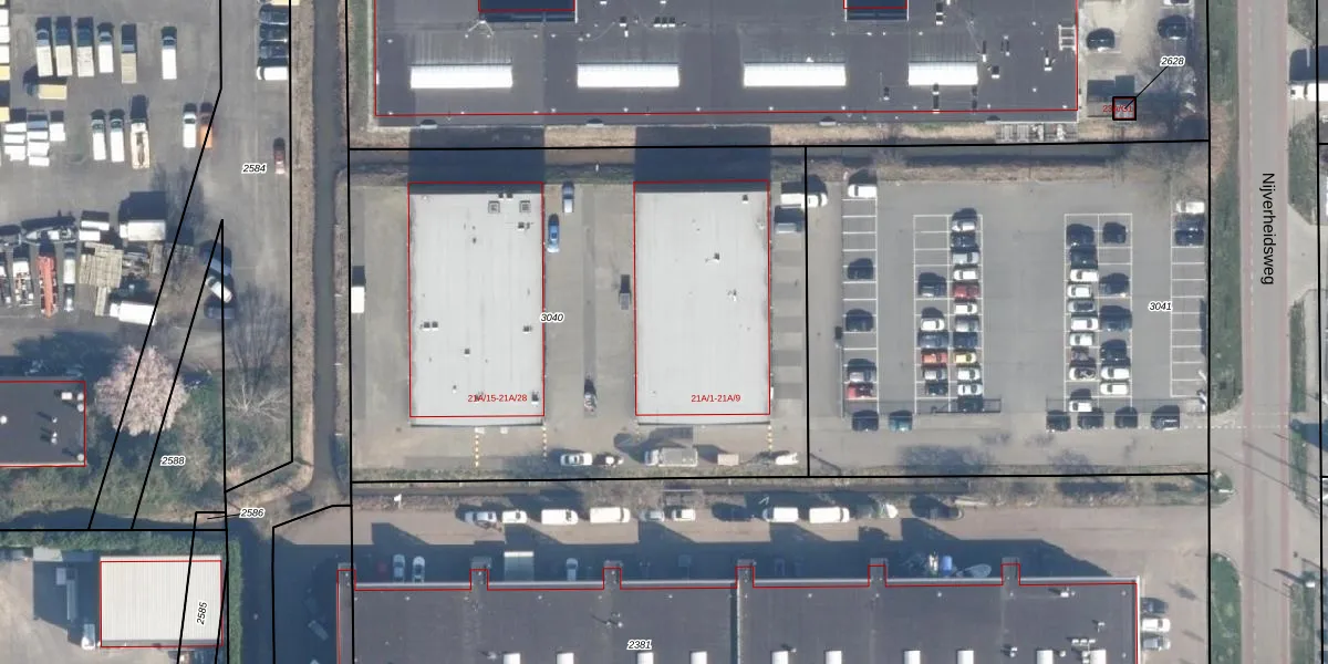 Het perceel waarop Nijverheidsweg 21-A-12 staat heeft een oppervlakte van 3460 m². Dit is een zeer groot perceel. De perceeloppervlakte wordt geregistreerd door het Kadaster. Gedetailleerde informatie over de maten van dit perceel kunt u vinden in het rapport Kadastrale kaart met maatvoering van Nijverheidsweg 21-A-12.