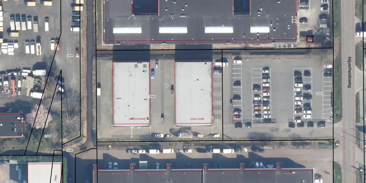 Het perceel waarop Nijverheidsweg 21-A-11 staat heeft een oppervlakte van 3460 m². Dit is een zeer groot perceel. De perceeloppervlakte wordt geregistreerd door het Kadaster. Gedetailleerde informatie over de maten van dit perceel kunt u vinden in het rapport Kadastrale kaart met maatvoering van Nijverheidsweg 21-A-11.