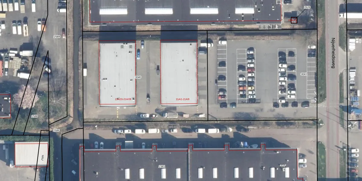 Het perceel waarop Nijverheidsweg 21-A-2 staat heeft een oppervlakte van 3460 m². Dit is een zeer groot perceel. De perceeloppervlakte wordt geregistreerd door het Kadaster. Gedetailleerde informatie over de maten van dit perceel kunt u vinden in het rapport Kadastrale kaart met maatvoering van Nijverheidsweg 21-A-2.