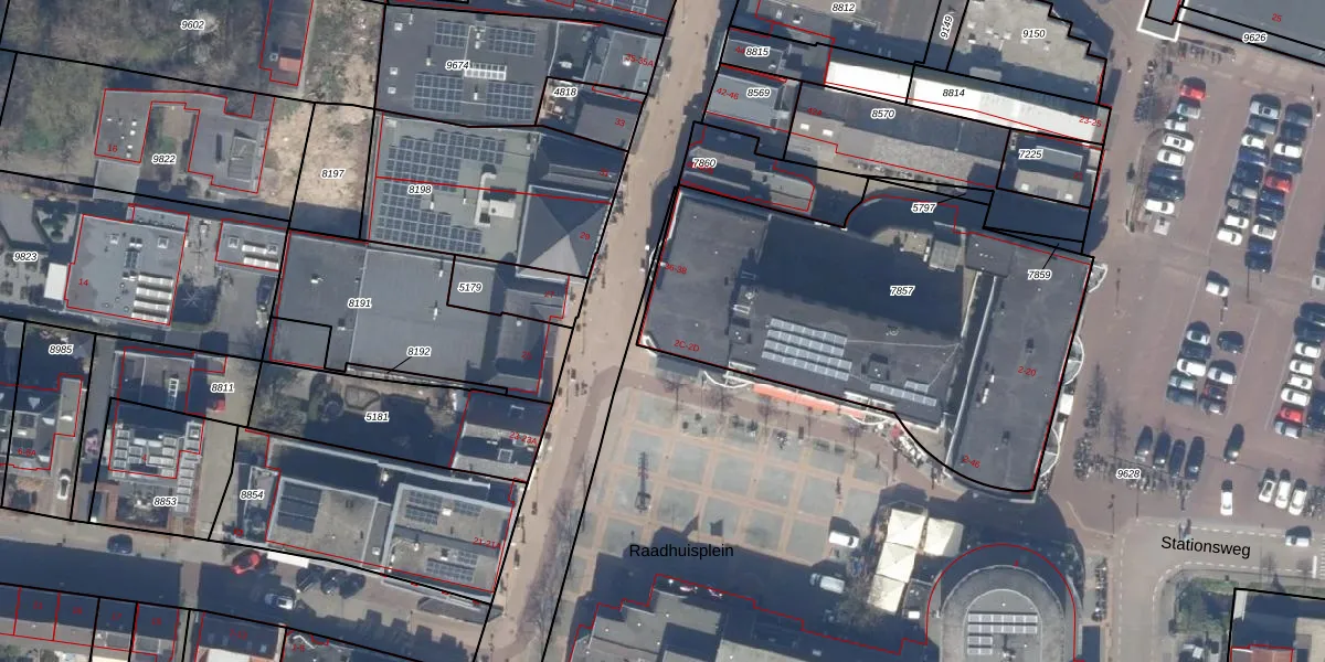 Het perceel waarop Raadhuisplein 24 staat heeft een oppervlakte van 1968 m². Dit is een zeer groot perceel. De perceeloppervlakte wordt geregistreerd door het Kadaster. Gedetailleerde informatie over de maten van dit perceel kunt u vinden in het rapport Kadastrale kaart met maatvoering van Raadhuisplein 24.