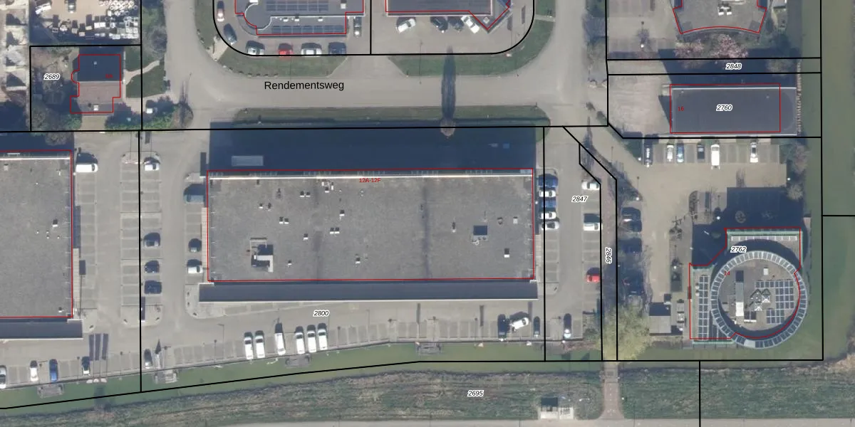 Het perceel waarop Rendementsweg 12-C staat heeft een oppervlakte van 5390 m². Dit is een zeer groot perceel. De perceeloppervlakte wordt geregistreerd door het Kadaster. Gedetailleerde informatie over de maten van dit perceel kunt u vinden in het rapport Kadastrale kaart met maatvoering van Rendementsweg 12-C.