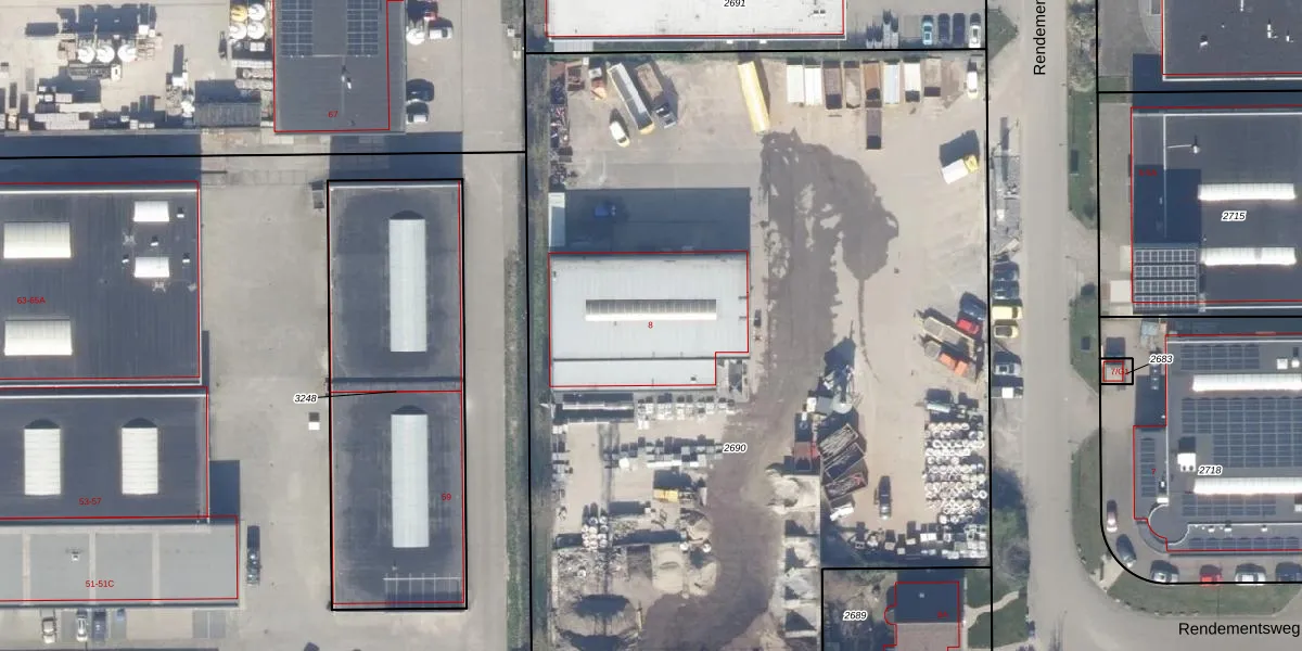 Het perceel waarop Rendementsweg 8 staat heeft een oppervlakte van 6535 m². Dit is een zeer groot perceel. De perceeloppervlakte wordt geregistreerd door het Kadaster. Gedetailleerde informatie over de maten van dit perceel kunt u vinden in het rapport Kadastrale kaart met maatvoering van Rendementsweg 8.
